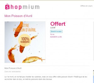 Une offre valable jusqu’au 2 avril .. Il faut acheter le poisson dans n’importe quel animalerie et ensuite demander le remboursement avec l’application shopmium