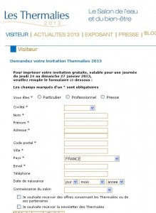 Pour les parisiens, si vous avez envie d’aller faire un tour au Salon Thermalie qui se deroule du 24 au 27 janvier 2013 , sachez qu’il est possible d’obtenir des invitations gratuites facilement au lieu de payer 10 euros la place sur place..