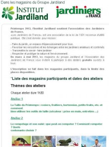 Pour ceux qui aiment jardiner et qui ne sont pas des experts, animations interessantes dans les magasins jardiland : en effet de mars à mai 2013 se deroulent dans les magasins des ateliers jardinage : A priori sur 2 themes : le rempotage et la taille ..