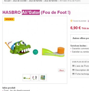 Enciore une bonne affaire pour un jeu pour enfants : 6.9 euros Ali Gator d’hasbro , une sorte de mini jeu de golf .. dans lequel on tire a balle avec une sorte de soufflet et il faut donc mettre celle ci dans la tete du crocodile ..