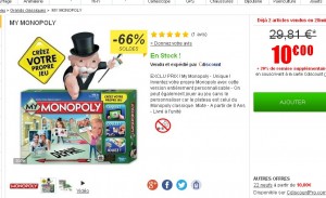 Bonne affaire pour un jeu de société : My Monopoly à 10 euros dans les soldes sur cdiscount … Une vestion speciale du monopoly dans laquelle soit on peut jouer au monopoly classique , soit on peut personnaliser son jeu avec des photos notamment …