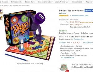 Bonne affaire pour le jeu de societé taboo xxl de parker : il est vendu à 26.51 euros sur amazon, ce qui est déjà vraiment pas cher car on le voir à plus de 40 chez carrefour, cultura , avenue des jeux et d’autres …