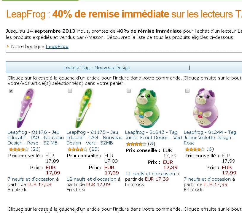 lecteur tagBonne affaire encore une fois sur amazon concernant des jeux éducatifs : cette fois ci ce sont les lecteurs electroniques Tag de la marque Leapfrog qui font l’objet de 40% de remise immédiates .. Ils sont vendus 17.39 euros alors qu’on les voit ailleurs generalement autour de 30 ..