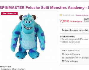 Pour comparer sur cdiscount il y a une peluche Sully à 10 euros sans les frais de port , mais celle ci ne fait que la moitié de hauteur .. 25 cm .. Et sinon la meme peluche de 50cm est vendue 29 euros sur le site de la fnac ..