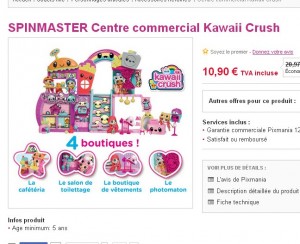 Encore une bonne affaire pour un jouet , si vous avez dans votre entourage une fillette de 5 – 9 ans .. Sur pixmania encore, dans les produits soldés on peut voir le centre commercial kawaii crush à 10.9 euros livraison incluse ..