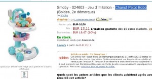 Encore une super affaire jouet dans les soldes sur amazon pour une petite fille .. Le jouet Chariot Petot Bobo de Smoby avec un poupon pour jouer au pédiatre est vendu 13.11 euros alors qu’on le voit generalement à plus de 30 euros .. Il est même vendu 51 euros sur le site de la fnac ..
