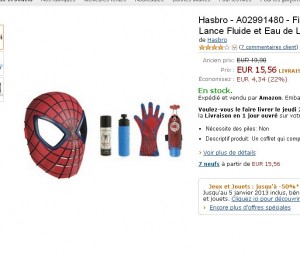 Bien évidemment trop tard pour noel, cependant si vous avez un garçon qui va avoir son anniversaire sous peu ou alors pour faire du stock en prévision de futurs cadeaux, bonne affaire sur amazon pour un jouet spiderman : le coffret incluant le masque , le gant et le systeme de projection de fluide est à 15.56 euros sur amazon .. Quand on compare les prix on voit ce meme jour à 28 euros sur cdiscount et meme à 33 euros sur le site de la fnac ..
