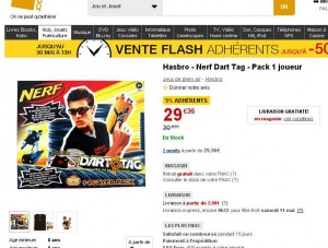 Encore une bonne affaire jouet sur amazon : le pack Nerf Dart Tag Pack 1 joueur est à 14.99 euros port inclu .. Pack regroupant un pistolet Dart Tag , des flechettes en mousses, une paire de lunettes et un tee shirt …