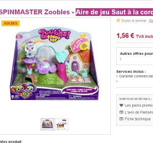 Bon plan jouet pour petites filles dans les soldes sur pixmania … avec l’aire de saut à la corde zoobles à 1.56 euros … Il est indiqué que son prix d’origine est de 3.99 euros mais en fait on peut voir ce meme jouet à 14.58 euros sur amazon …