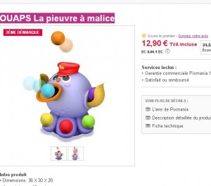 Et encore une bonne affaire jouets pour petits enfants dans les soldes sur pixmania .. Il y a la pieuvre à malice de Ouaps à 12.9 euros livraison incluse ..