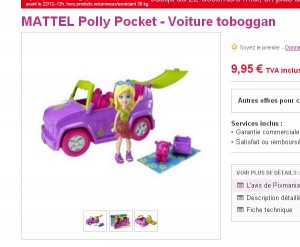 Sur pixmania , la livraison est gratuite en express sans minimum et garantie pour noel pour une commande jusqu’au 22/12 midi et si vous cherchez un petit jouet pas cher pour une petite fille , on peut y voir la Polly Pocket avec sa voiture à 9.99 euros ..