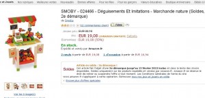 Toujours quelques bonnes affaires dans les soldes jouets sur amazon .. Comme par exemple le stand de marchande smoby .. Qui chose rare est en bois plutôt qu’en plastique .. Soldé à 50% à 19.08 euros port inclu ..