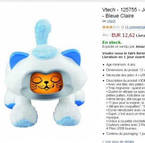 Et encore une offre jouet interessante sur amazon : l’animal electronique Vtech Kidiminiz Kidicaline Bleue claire est à 12.62 euros …