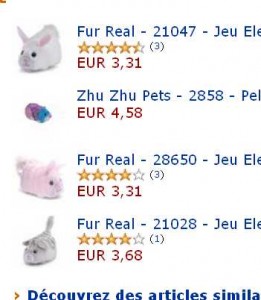 Encore de très bonnes affaires jouets dans les soldes sur amazon : cette fois ci concernant les petits animaux electroniques Zhu Zhu Pet , Fur Real , petits animaux qui se deplacent dans tous les sens en faisant du bruit ..