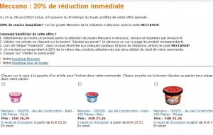 Une autre offre jouet sur le site amazon : 20% de remise immédiate sur une selection de jouet de la marque Meccano pour un achat d’ici le 28 avril 2013 .. Il y a des barils de pieces et sinon des boites avec plusieurs modeles à construire