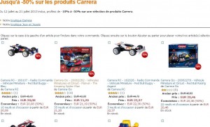Des économies sur des jouets sur amazon et plus particulierement sur des voitures radiocommandées et circuits de la marque Carrera .. En effet le site propose jusqu’à 50% de remise sur certains jouets .. On peut donc voir des voitures radiocommandées à partir de 15 euros, des circuits à partir de 21 euros ..