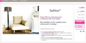 Bonne affaire sur le site venteprivee ,qui propose pour 200 euros un bon d’achat d’une valeur de 400 euros valable sur l’ensemble des articles vendus dans les magasins habitat ..
