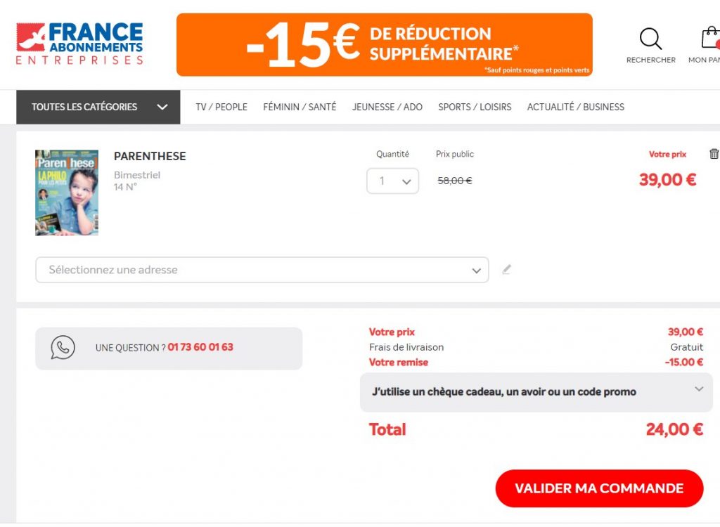 En fait l’abonnement à Parenthese est proposé à 39€ mais on va bénéficier de 15€ de réduction immediate dans le panier et le prix à payer ne sera donc que de 24€..