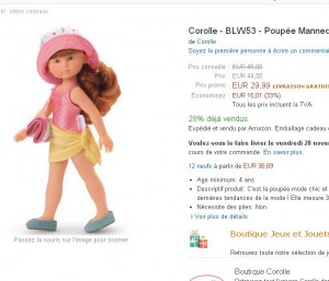 Bon prix en vente flash pour une poupée corolle semble t il sur amazon .. 29.9 euros la poupée corolle les cheries « Clara Cote Soleil » … Une poupée qui a l’air de se vendre ailleurs autour de 40 euros .. notamment à Toy R us qui la propose à 44.95 euros sans les frais de port ou avenue des jeux à 42.99 euros …