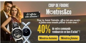Super affaire si vous désirez offrir une montre pour la saint valentin par exemple : Sur le site montre&co , spécialisé dans la vente de montres en ligne, l’achat d’une montre fait l’objet d’un remboursement de 40% du montant sous forme de bon d’achat..