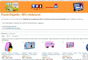 Si vous avez des enfants qui aiment les puzzles, une offre de la part de l’editeur dujardin est interessante : en effet pour l’achat d’un puzzle dujardin d’ici le 31 mars 2014 il y a le remboursement à 50 pourcent de son prix ..