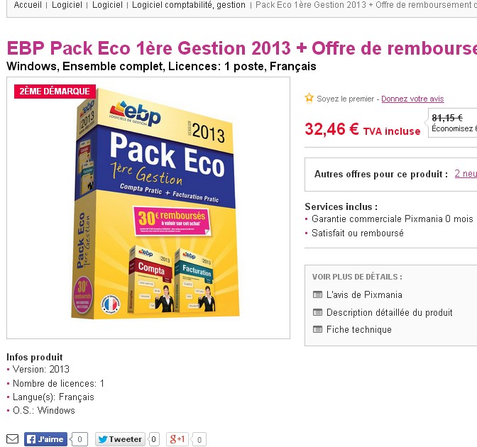 De meme sur pixmania il y a un autre pack .. le pack entreprise avec compta + facturation + devis à 53.31 qui fait l’objet lui de 50 euros de remboursement , il revient donc à moins de 4 euros …