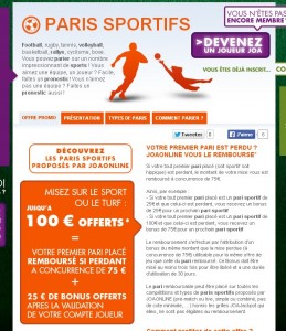 Encore une offre pour parier sur la coupe du monde de foot qui peut etre interessante : joaonline filiale de la chaine de casinos française joa propose l’offre suivante : 1er pari remboursé dans la limite de 75 euros dans le cas où il est perdu … Cependant contrairement à betclic on ne peut pas retirer l’argent … Il faut le rejouer au moins 3 fois pour pouvoir le retirer …