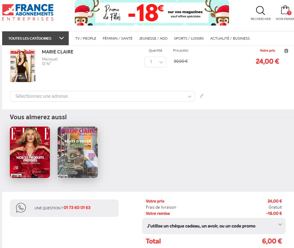 En effet sur le site de France abonnement, l’abonnement à MARIE CLAIRE de 18 mois est proposé à 36€ mais en plus on a une remise immediate de 15€ ce qui fait donc passer le prix à 25€ seulement