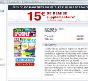 Bon plan pour s’abonner au magazine REPONSE A TOUT : alors que pour un an , si on l’achete en kiosque le prix sera de plus de 45€ , en profitant d’un prix réduit et d’un code promo, on peut avoir l’abonnement à 21€ seulement chez kiosque FAE ( France abonnement) ..