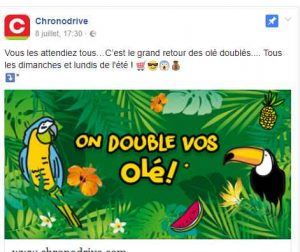 Des tres bonnes affaires possibles dans les magasins drive « CHRONODRIVE » .. avec durant l’été jusqu’au 22 aout le doublement du credit fidelité OLE pour un retrait les DIMANCHES OU LUNDI (attention pour certains magasins l’offre n’est valable que pour un retrait le lundi .. voir modalités au dessous ) ..