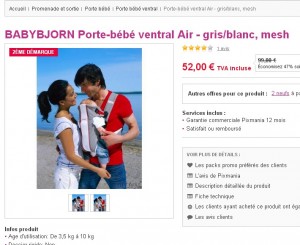 Vous avez un bébé et vous voulez un porte bébé pour pouvoir le balader sur vous ? Bonne affaire dans les soldes puericulture de pixmania .. On peut trouver un porte bébé ventral de la celebre marque babybjorn à 52 euros livraison incluse .. Le modele Ventral air gris / blanc que l’on voit generalement un peu partout entre 80 et 100 euros