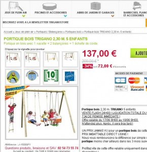 Ce sont les beaux jours .. Si vos enfants n’arretent pas de vous demander une balancoire dans votre terrain, bonne affaire sur le site trigano .. En effet on a en vente de destockage jusqu’au 18/6 à 9 heures un portique en bois de 2m30 à 137 euros port inclu …