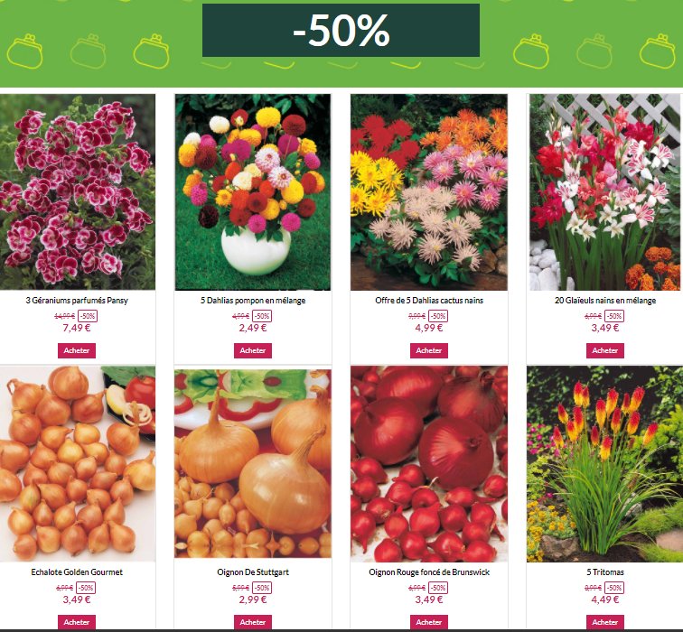 C’est le printemps , et l’époque ou l’on peut planter des fleurs , bulbes , mais aussi faire son jardin .. et voici une offre interessante jusqu’au 8 avril chez WILLEMSE avec une sélection d’articles qui bénéficie de 50% de réduction