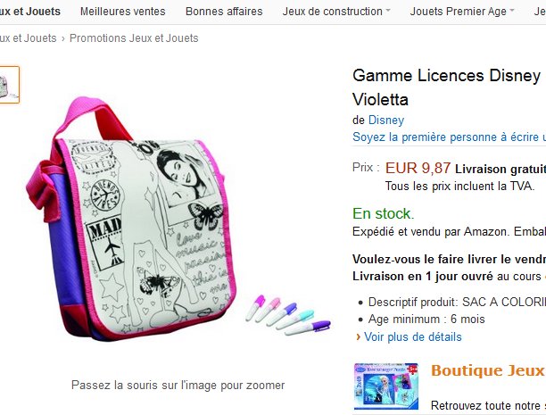 Bon prix pour un sac à colorier Violetta sur amazon : 9.87 euros et meme 8.87 euros pour les abonnés premium amazon qui choisissent la livraison gratuite en 4 – 5 jours …