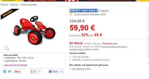 Encore une autre très bonne offre jouet en prevision de noel sur pixmania dans les soldes : le kart à pedale cars 2 pour enfant de smoby est à 59.90 + 16.99 euros de frais de port soit donc 77 euros ..