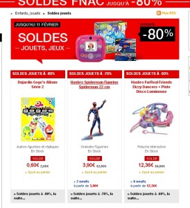 Jusqu’à 80% de remise dans les soldes jouets sur le site de la fnac . Avec par exemple à moins de 8 euros des animaux electroniques fureal .. ou encore une piste hotwheels à 6.18 euros , la maison de maquillage hello kitty à moins de 9 euros ,