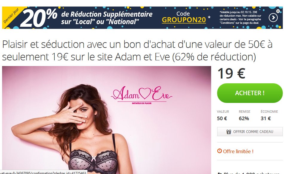 Sur groupon le 22 novembre , on peut acheter pour 15.2 euros un bon d’achats d’une valeur de 50 euros à utiliser sur le site specialisé adam et eve ..