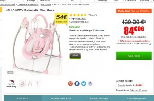 Super offre pour les jeunes parents (ou futurs parents ) d’une toute petite fille .. Sur cdiscount on peut voir une balancelle hello kitty à 89 euros mais beneficiant de l’offre de remboursement à 110% sous forme de 3 bons d’achats ..
