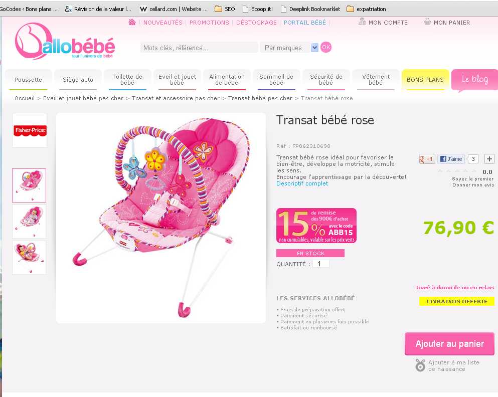 Quand on compare les prix , on voit que ce meme transat se vend au mieux à 45 euros chez pixmania, mais que son prix monte meme à 76.90 euros chez allobebe