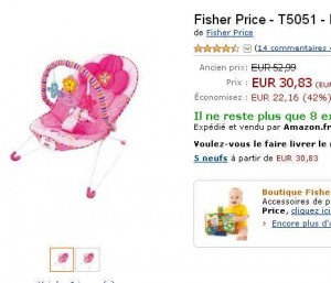 Encore une bonne affaire dans le domaine de la puericulture sur amazon .. On y trouve en effet le transat fisher price rose pour petites filles (à priori) pour 30.83 euros .. Transat avec systeme de vibrations pour endormir le bébé … Et avec un arche comprenant des petits jouets pour occuper l’enfant ..