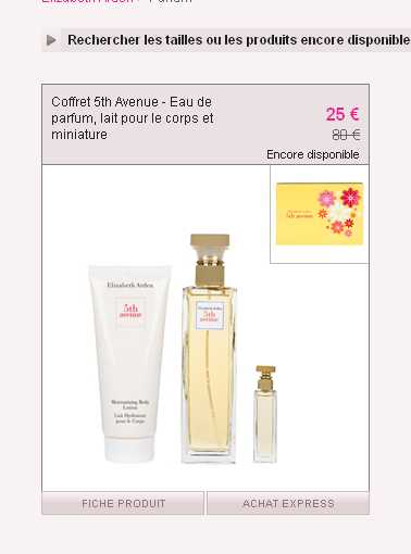 (si vous n’etes pas membre , apres avoir cree votre compte, il faudra aller dans la vente « elizabeth arden » , dans la rubrique parfum pour voir le coffret « 5th avenue » )