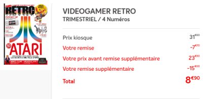 En effet surFrance Abonnement , l’abonnement annuel à Video Gamer Retro est à proposé à seulement 16.83€ ca fait presque 15€ de réduction sur le prix au numéro