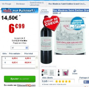 Une offre vin qui parait interessante sur cdiscount : la bouteille de saint emilion grand cru Roc Maubras 2006 est en vente flash à 6.99 euros ..