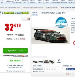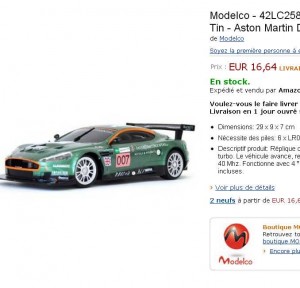 On a ainsi l’ Aston Martin DB9 RC à 16.64 euros (Cliquez ici pour voir cette voiture ) .. trers bon prix quand on voit que cette meme voiture est à 32.19 sur cdiscount