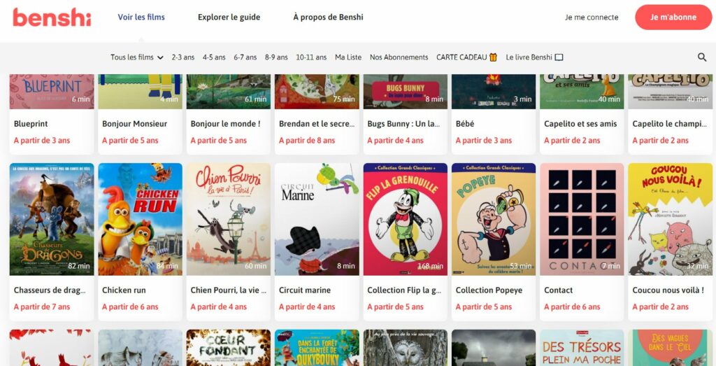 Dans l’interface du site (https://benshi.fr/ ) on peut voir rapidement les films et courts metrages pour chaque tranche d’age