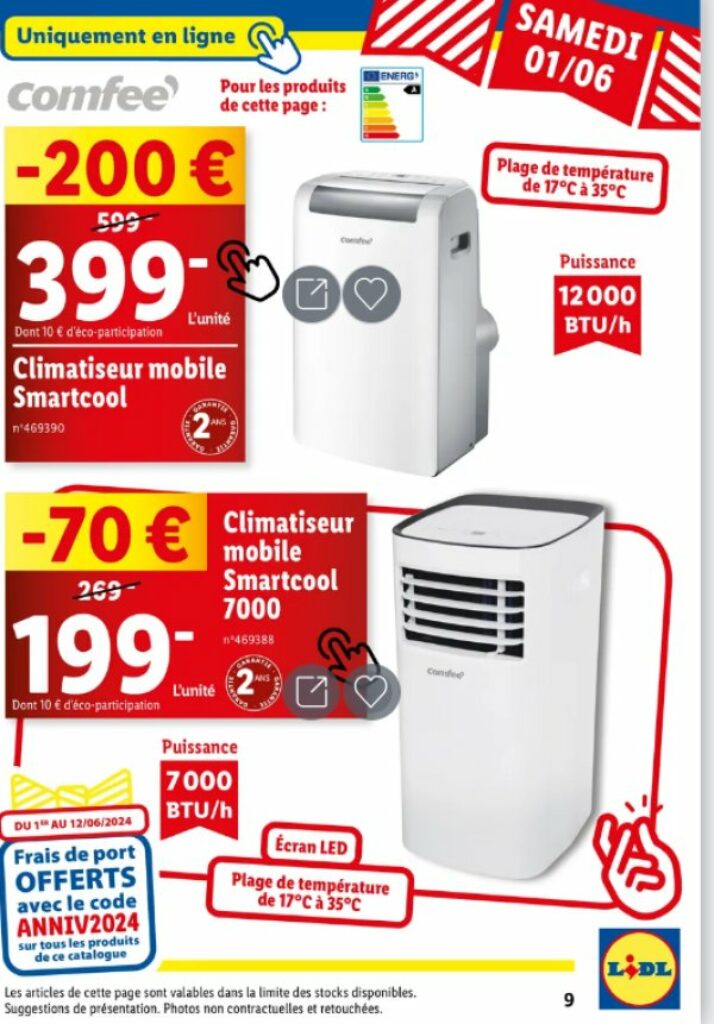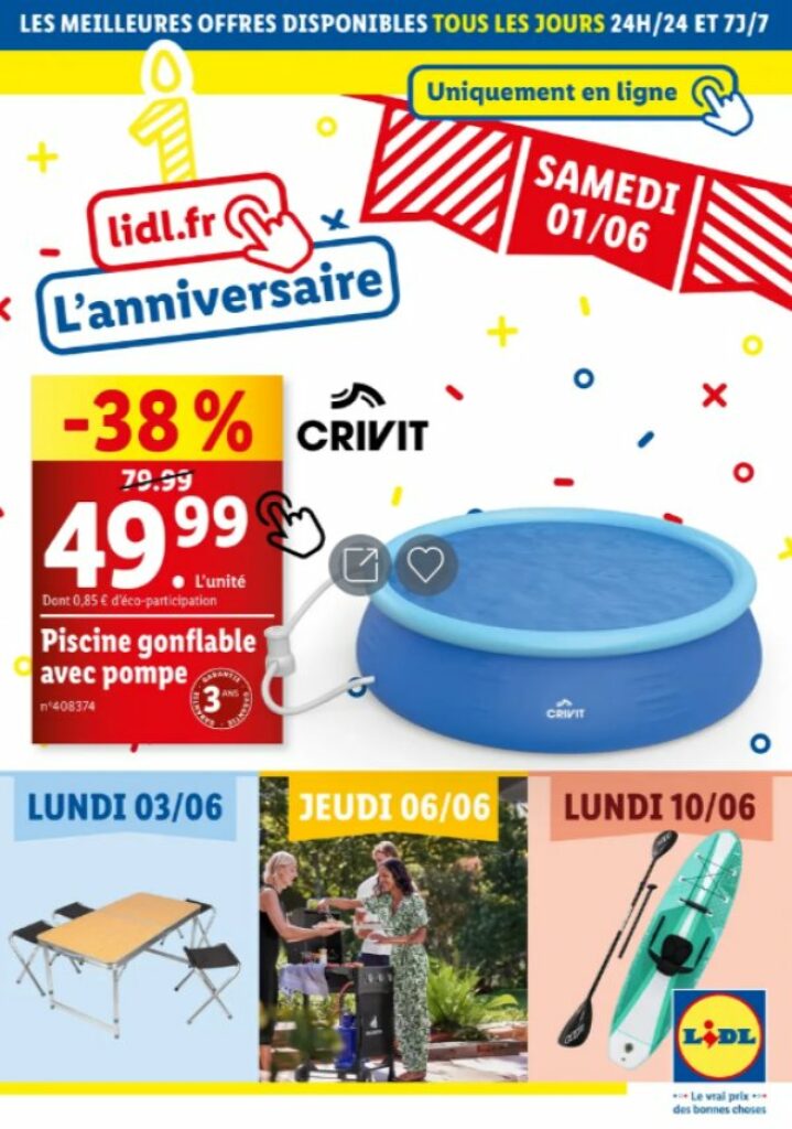 Par exemple le 1er juin, il y a une réduction sur une piscine autoportante , sur un hachoir , sur une friteuse , sur des climatiseurs (climatiseur 7000btu qui passe à 169€ ) .. le 3 juin sur des articles de plages et d’eau ( canoe , paddle , tente de plage …)