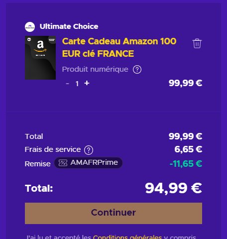 Grâce au code promo « AMZ100FR » à saisir dans le panier de commande , le prix de la carte cadeau Amazon de 100€ passe ainsi à 93.99€