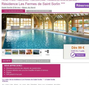 Et une semaine de vacances à la montagne à tout petit prix qui permettra de vous depayser .. Sur le site madamevacances, on peut donc reserver pour 99 euros une semaine à saint sorlin d’arves pour un logement pour 4 pour 99 euros .. Il y a cependant 9 euros de frais de dossier en supplement, mais en utilisant le code promo « MV5 » , on a 5% de remise .. Cela fait donc en tout un prix à payer de 103.5 euros ..