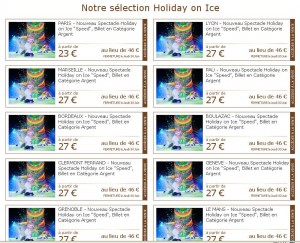 En effet le site brandalleyvoyage propose ces billets pour les villes de la tournées (paris, lyon, bordeaux , pau , marseille ..) entre 23 et 27 euros au lieu de 46 euros prix affiché sur le site officiel ( http://www.holidayonice-presse.com/ )