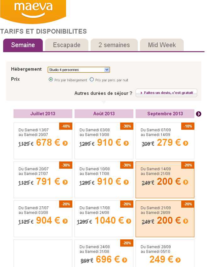 sur le site maeva le studio pour 4 est à 678 pour une arrivée le 13 juillet et 791 pour une arrivée le 20 juillet